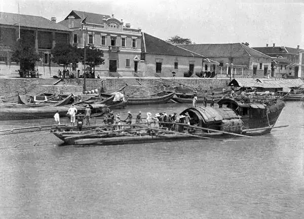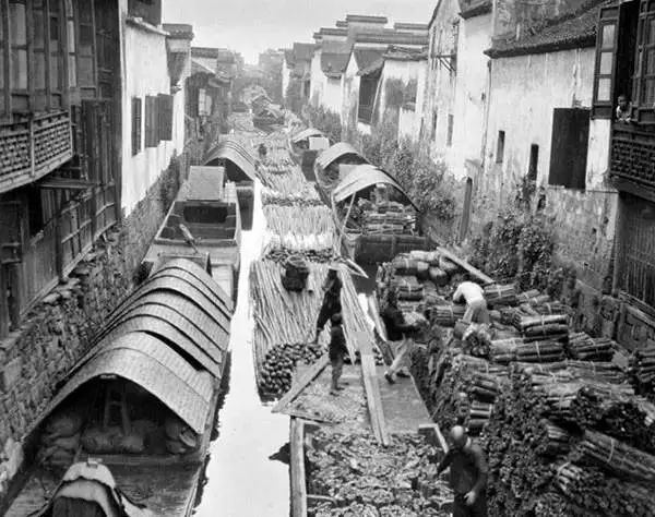 杭州,大運河裡裝載木材的船隻。