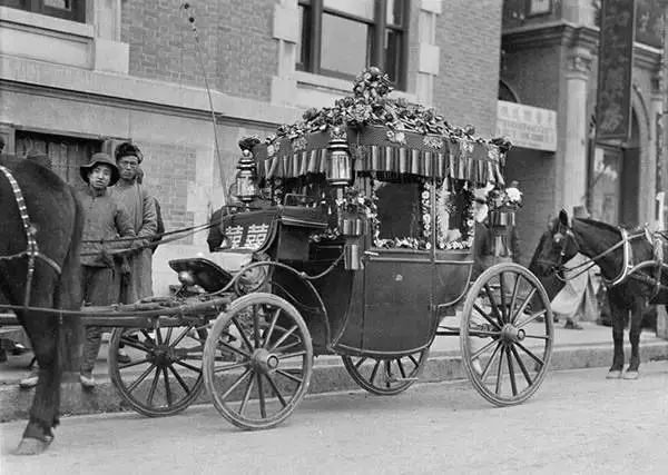 天津,東馬路青年會門前等待新人的馬拉轎車。