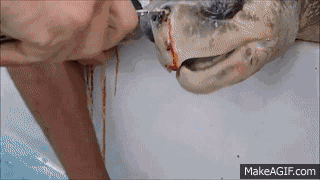 這個過程海龜痛苦萬分, 鼻孔鮮血直流。