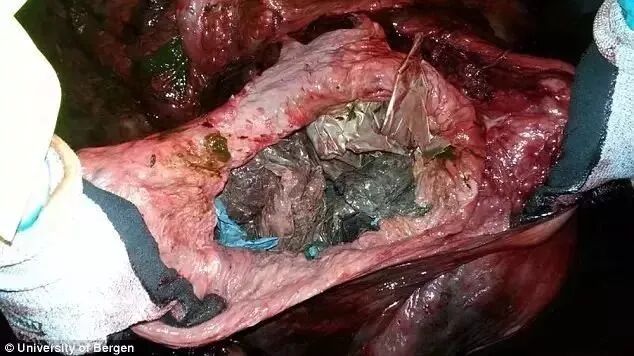它的胃裡沒有任何食物, 取而代之的是塞滿了30多個塑料袋。