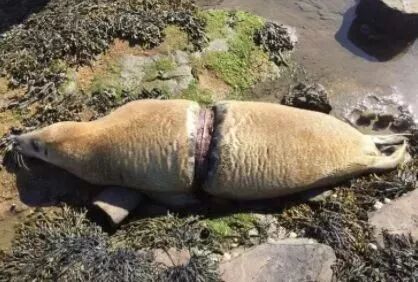它被塑料打包環死死套住, 自己沒辦法弄掉, 越長大就越緊, 最終打包環卡進它的肉裡。