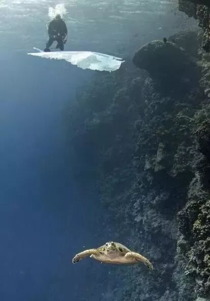 還有一位潛水大叔在海底發現被塑料卡住喉嚨的海龜。