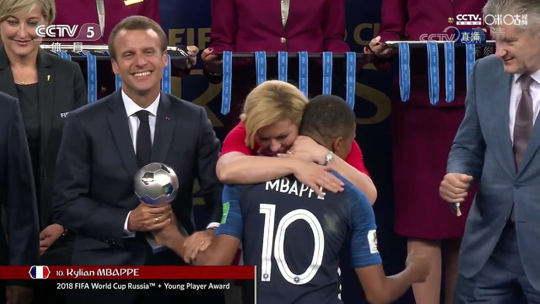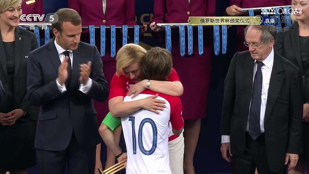 穿著克羅地亞球衣的她 在為法國球員頒獎時 沒有沮喪沒有哭泣 只是為這些法國小伙子們 送去了讚賞的微笑 以及鼓勵的擁抱