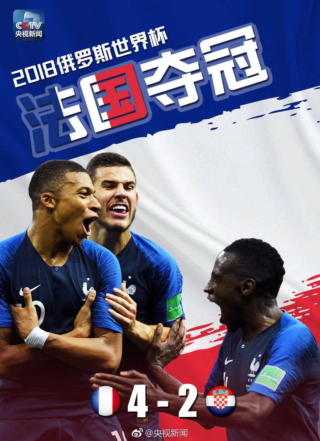 經過90分鐘的酣戰 一路高歌猛進的法國 把勝果擴大 以4:2的比分 成功戰勝了經驗老成的克羅地亞 把大力神杯帶回了家