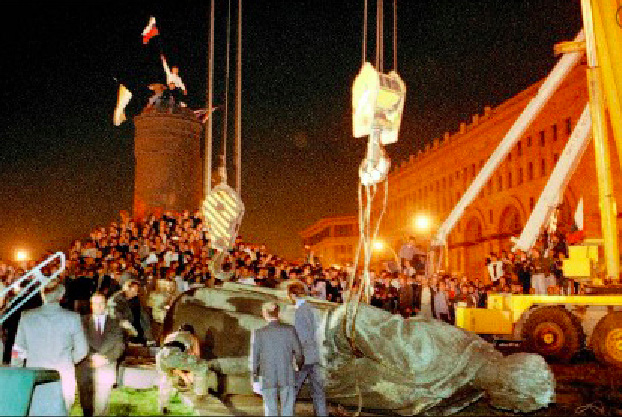 蘇聯1991年8月變天現場。人民拉倒KGB頭子捷爾任斯基銅像,揮舞俄羅斯三色旗,蘇共倒台。沒有千百萬人頭落地。