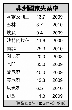從突尼斯到埃及,從埃及到利比亞,這三個北非大國危機連鎖反應何以如此之快、之猛,令人驚訝,其深層的原因何在?許多人將經濟的落後、通貨膨脹、失業、貪污當作這次「茉莉花革命」的基本原因,但這只是一個社會背景,因為經濟問題很多國家都有。以失業而論,埃及人口八千萬,平均年齡二十四歲,失業率百分之九點五,因此,這次上街的年輕人多。但失業率並不等於大規模動亂,下表可見埃及並非失業高端國家: