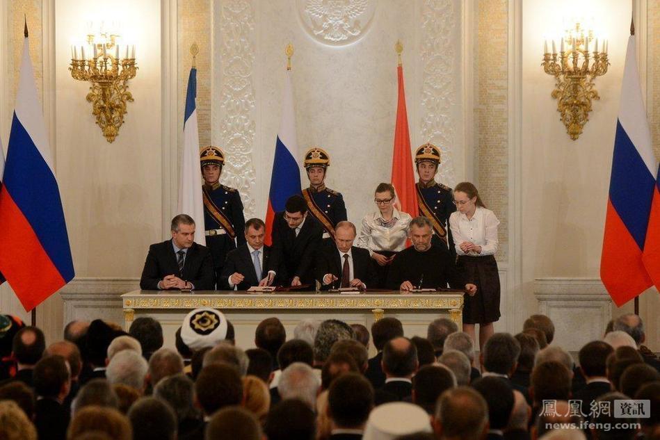 【觀察者網說明:3月18日,俄總統普京、克里米亞議會議長康斯坦丁諾夫、克里米亞總理阿克肖諾夫和塞瓦斯托波爾市議會主席恰雷,共同簽署有關克里米亞共和國和塞瓦斯托波爾市加入俄羅斯聯邦的條約。簽字儀式結束,俄羅斯國歌奏響在克里姆林宮。在簽字的前一刻,當天下午3時,普京在克里姆林宮向議會上下兩院發表電視演講,就克里米亞問題闡述俄方立場。現場聽眾包括 俄國家杜馬議員、聯邦委員會成員、俄聯邦各地區負責人和公民社會代表,以及前來商討入俄事宜的克里米亞領導人。普京發表了極具愛國激情的演講,不時為與會 者全體起立歡呼、鼓掌喝彩和淚水所打斷。據克里姆林宮網站消息,自3月18日起俄羅斯的法律及其它法規在克里米亞和塞瓦斯托波爾正式實施。】