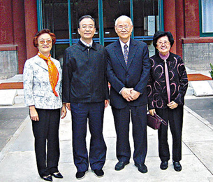 ● 溫家寶4月23日在中南海會見香港老左派吳康民夫婦(右),夫人張蓓莉(左)罕見地露面合影,並予以發表。動作不同凡響。引起高層分歧的種種解讀。(互聯網)