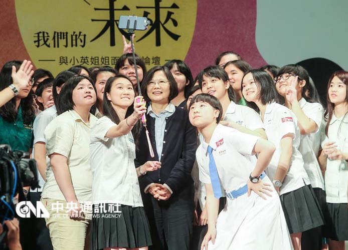蔡英文一進場,女學生高喊「小英姐姐」,她笑稱,有點不習慣,因為以前進場台下都喊「凍蒜」。