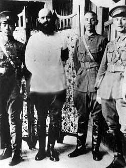 ● 鮑羅廷(左二)作為孫中山的高級政治顧問,1927年在廣州和黃埔軍校校長蔣介石(左三)的老照片。(本刊資料)