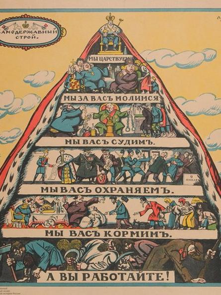 社會金字塔:這是另一個馬雅可夫斯基 - 拉達科夫與帕魯斯(Parus)的合作。這張海報顯然是一張漫畫。畫面上展示了沙皇和他向下擺的貂皮長袍。長跑遮住了人民。從上到下寫著:「我們統治。我們為你祈禱。我們評判你。我們保護你。我們餵養你。你工作。」直到1917年夏天最流行的諷刺故事是反文書和反君主制,那些特別針對沙皇尼古拉二世和他的妻子尤為流行