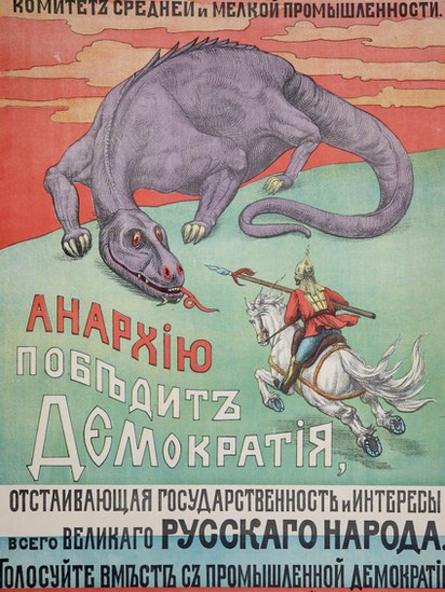 民主將打敗無政府狀態:這是一個軍校黨的海報,主要用動物和神話圖像表達:大蜥蜴代表無政府狀態,白馬騎士代表民主。