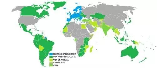 好了,其實這也沒什麼了不起的,虛名而已。最大的賣點是馬耳他護照能夠免簽全球168個國家和地區,包括美、加、澳等國家,具體可以看看下面這張圖: