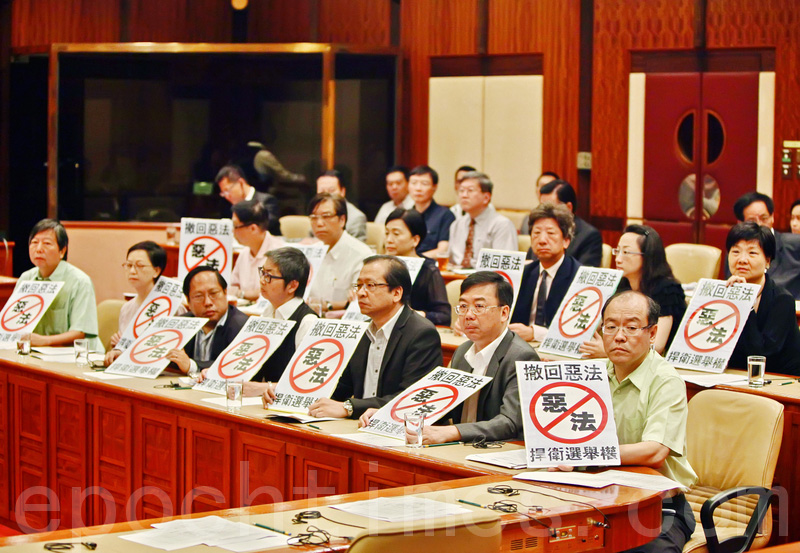 ●民主派議員在立法會舉牌反對通過剝奪港人選舉權的替補方案。(互聯網)