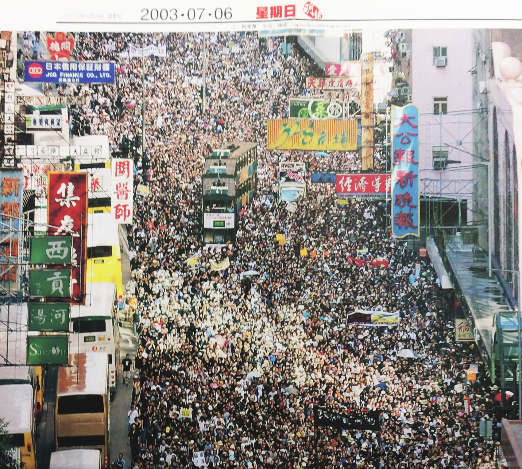 新聞自由是香港人最珍惜的價值觀。這是2003年50萬人七一大遊行的報導(明報)。