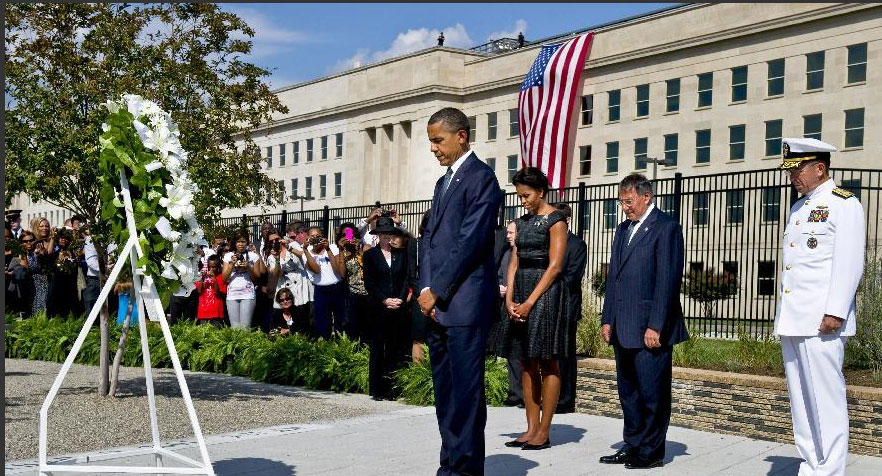 ●奧巴馬總統在911恐襲十週年日,前往五角大樓現場,向遇難者致哀。(網上圖片)