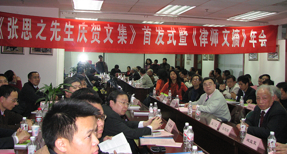 老少群賢恭賀張思之 《張思之先生慶賀文集》首發式暨《律師文摘》年會一月十九日在北京舉行。中國大陸著名的律師刊物《律師文摘》步入了第六個年頭,該刊傳統的迎新年會,年年都是律師業的盛會,而且年年都有一個不同的主題,今年的主題是為張思之先生八十華誕暨執業五十周年的慶賀文集──《耄耋律師仍少年》舉行發行式,因此「老少咸集,群賢畢至」的範圍有所擴大,不僅有杜光、姚監復、章詒和、章立凡、丁東、傅國湧、張耀杰一大批著名作家、學者前來祝賀,還有陳子明、王之虹夫婦、劉曉波、曹思源一批知名的八九民運要犯躬逢其盛,我則是張先生的當事人。《耄耋律師仍少年》取自著名法學家賀衛方的同名慶賀文章,紀念文集由《律師文摘》主編孫國棟、中國律師網主持人趙國君兩位年輕人編輯,獲得律師業和知識界的廣泛支持,終於在○八年凜冽的嚴冬催開了一片美麗豐饒的人性、正義和良知之花。 正因為這個花的主題,年會遭遇到意想不到的麻煩。十八日中午,原定會址北京航空航天大學突然以奧運場館測試為理由,拒絕出租會議中心。幸得易和律師事務所在緊急之中伸手相助,使發行式如期舉行,易和所在的煤炭大廈如臨大敵,來賓一律登記電話和身份證。全體來賓拍合影,大堂不允許,移到大廈門口又遭遇樓上特殊身份的人用對講機指揮保安粗暴干預。小小插曲,大概是要通過對講機讓上司們親耳聆聽,對發行式沒有產生絲毫干擾。 發行式進行的隆重而熱烈,因為會場不夠大,年輕人站了裡三層外三層。法學界耆宿江平首先發言,他列舉五個理由稱讚張思之是「中國律師第一人」,第五個理由是:「在近二十年國內各種政治風波中出現的政治審判案件中,能夠秉著良知和良心,頂著巨大政治壓力走上法庭為被告據理辯護的,他當之無愧地稱的上是律師界中的第一人。」江平提出要發揚「思之精神」。會議高潮是劉曉波的發言引起。他認為是責任倫理讓張思之的勇氣昇華,而這正是當前律師界欠缺的精神,一些年輕律師不是在為當事人爭取最大的利益,而是為自己出名,寫出的辯護詞就像政治宣言,這樣的辯護能勝的案子也得打敗。律師界就劉曉波提出的重任倫理展開熱烈討論,大家認為「思之精神」就是法律精神。張先生敢於為重大的政治案件做無罪辯護,從沒有超出法律框架。他自己謙稱的「屢戰屢敗」,是制度的猙獰和無理。 發行式進行四個小時,來賓仍舊意猶未盡。在熱烈的掌聲和歡呼聲中,張思之先生以一貫的謙遜和熱誠致了精彩的答詞。晚上,大家舉杯,並給壽星老帶上皇冠,張思之借酒調侃,這是他五十年後第二次戴帽子。