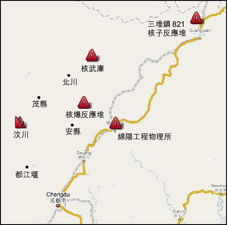 綿陽市的兩彈研究基地 這個代號為九○二工程的四川核基地在這次大地震中雖然被曝光,但人們至今所知甚少。廣為人知的大概只有位於綿陽附近兩彈(原子彈、氫彈)研究基地中國工程物理研究院,中物院原在青海海晏縣,一九六八年遷到綿陽。綿陽是中國國防科研工業中心。台灣的報導說,綿陽市五十萬人口,就有三十萬人從事國防科技。 根據中國工程物理研究院的官方網站介紹,中物院主要從事衝擊波與轟爆物理、核子物理、等離子體與雷射技術研究,其中設有「核物理與化學研究所」科研人員包括專業技術人員八千餘人,其中高級專業支術人員兩千餘人。台灣核子科學家清華大學教授鍾堅說,中物院不負責核武器生產,應該不會儲有核材料,應該不會有核污染的疑慮。另據海外核物理學家說,中物院是核研究基地,應該有作研究用的核反應堆。不過人們最關注的是中國藏匿在綿陽深山中而受到地震破壞的核武器庫和核生產基地。 廣元三堆鎮八二一核反應堆 據各方報導,中共在四川綿陽山區至少有三座核設施。其中一座位於廣元西北十五英里白龍江畔三堆鎮,名叫八二一工廠。這座核反應堆已曝光。據軍事專家平可夫說,這個核設施在中共軍方內部稱作八二一堆,於上個世紀七十年代中期投產,生產中共核武原料鈽(? ),中國DF5洲際彈道導彈的彈頭使用的反應燃料就在這裡生產。他說,八二一堆因為產生的廢氣、廢水、廢物在八十年代就被發現安全存在隱患,同時又因為薪水糾紛曾引發工人多次示威抗議。平可夫要求中共就八二一堆的安全問題向國際社會作出交待。平可夫並說,中共還有一座核子反應堆,代號稱八一六堆。 一位在三堆鎮長大的八二一堆職工子弟在網上說,八二一廠是建三線時,從甘肅玉門的四○四廠調來工人,加上大批軍人和北大清華畢業生,於一九六九年選址廣元地區山區中的山區開始興建,一九七二年建成,在三堆鎮大山中形成一個封閉的小城市,市場、醫院、學校、電影院......應有盡有,而且不少東西免費。八十年代中國加入核不擴散條約後,這個工廠已經江河日下,但仍在營運,現在的秦山、大亞灣核電站的很多技術人員由該處調過去,核燃料也由該廠提供運過去。 不過這次廣元三堆鎮雖然是災區,民房倒了百分之二十,但傷亡很少,估計八二一廠的損毀應不嚴重。造成至少六員工死,數十枚放射源被建築崩塌掩埋的應是另兩座核設施。 綿陽深山中核武庫和核反應堆 紐約時報援引核專家的話說,距離此次地震震中不遠,從綿陽市向西開車兩小時,有一個中國高度保密的核基地,設有一座高速爆裂的核反應堆,再朝北走,更近震中一個更為難以進入的山區,有一個隱密的巨大復雜的地下通道,儲存中國的核武器。網上有位熟悉該地區地形的網友根據此線索將這兩個核設施的方位在谷歌地圖上標了出來。這個離震央很近的核武庫大約於北川縣靠江油的方向,在九黃公路南坪縣至平武線段的正下方。另一座核設施即很有可能是平可夫所謂的八一六堆的核子反應堆,則標示位於安縣桑棗鎮以北,千佛山以西,四川江油風光洞之西南,估計應在安縣與茂縣,北川交界處的深山中,離安縣兩個高山村寨高川鄉(海拔二○○五公尺)和茶坪鄉不遠。由這次安縣西北遭重災但災情竟被封鎖長達三、四天的反常情況來看,估計與八一六核反應堆有關。 安縣舊縣城安昌鎮離北川僅二十公里,而且離震央汶川映秀鎮比北川更近,因此這次地震災情也相當嚴重。五十萬人的安縣二十餘鄉鎮遭重災,安昌鎮倒塌房屋百分之八十,在深山中的茶坪、高川兩村寨更因山崩地裂,房屋倒塌被掩埋達百分之九十五,唯一出山公路被截斷。翻高山越原始森林逃出來的災民和千佛山遊客說,這兩個鄉有兩千多人死亡,四五千人受傷,一萬多人被困。安縣官方十五日也公佈說全縣有一千三百三十九人死亡。但奇怪的是,在頭三日大陸媒體的災情報導中,災區中根本未提到安縣這個地名,而該縣縣委書記還在對新華社記者說,「我們安縣的災情不嚴重,我們能生產自救」,竟拒絕外來援救。以至世人不知安縣也是災區。 為保核機密封鎖安縣災情 一直關注新聞的我,直到五月十七日打電話回四川問到曾插隊安縣的同學才知道安縣受災不輕。由於安縣災情被封鎖,安縣五十萬災民多日竟無外來救助,當局任其自生自滅。憤怒的災民和在外打工讀書的安縣子弟在網上悲號求助,無不痛罵縣政府狗官喪盡天良。但有知情的網友披露安縣災情被封鎖是另有隱情。一位網友五月十七日在網上寫了這樣一段話: 「是綿陽不管我們 要我們自己管自己啊, 而且濤哥路過我們安縣 看到花荄(安縣新縣城),位於平壩該沒有事,就沒有操心啊,我都要氣死了,這幾天一直弄網上 打電話去政府 又打去央視,這是我瞭解到了我們安縣死了幾千了 ,綿陽市不信啊,他們也不下來看你們都錯了,政府不去救安縣還有封鎖安縣災情的消息的真實原因還不是當地政府的問題,我不敢說。我為安縣人民哭泣!!! 為甚麼只封鎖安縣的災情,你們想想到底甚麼原因?猜測可能真的是因為我們這邊的某某基地太多了!大家請稍微冷靜下想想,涉及到國家安全問題!大家自己想嘛。我們安縣的基地很多!我在軍校待過,上過保密課!這關係到國家安全問題!但是我還是為安縣的那些無能官員憤怒!我們只能自救!堅持......」 從這個網友傳遞的訊息可知,