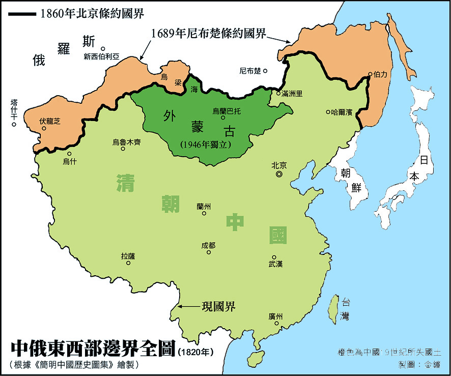 中俄邊界之爭,其實從一六八九年的《尼布楚條約》就已發端,而不是中方一直強調的該約「公平合理」。《中俄國界東段的演變》是中共最新的關於東段邊界爭議的官方著作,作者姜長斌任中共中央黨校國際戰略研究所教授,是中共研究「後冷戰時期」國際問題的專家,此書去年十一月出版,由前駐俄羅斯聯邦大使曾參與中蘇邊界談判全過程的李鳳林作序。李序證實中蘇邊界核心分歧,就是蘇方堅持《尼布楚條約》是對俄國的不平等條約,後來璦琿、北京二約,便是俄國收復失地。姜長斌介紹了俄國歷史學家格.季列耶夫有代表性的觀點,作為俄方堅守一八六○年《北京條約》不是不平等條約的理據,他認為: