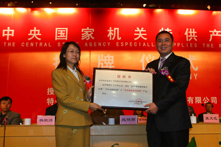 ● 國務院中央機關食品特供中心主任祝 口永 蘭(左)向生產商授予合格證。