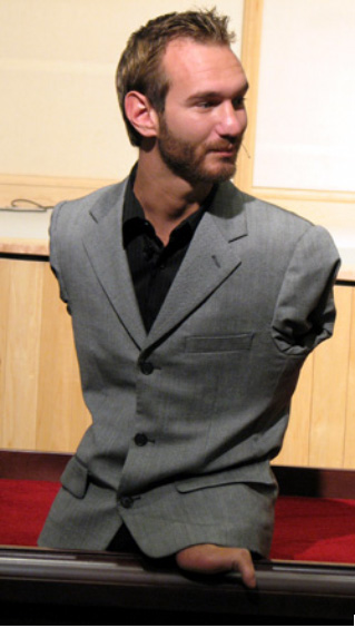 「放棄•奮起」﹝Give Up Get Up﹞,是本港樂苗基金與中國基督教播道會同福堂邀請力克來香港的主題,十一月下旬頭五天,其中,二十三號「國際復康日」,於赤臘角機場亞洲國際博覽館舉辦一天兩場預定三萬人的佈道會,由於反應熱烈,加開兩個直播展示廳,四萬觀眾親眼親耳欣賞「無肢力克•力克無肢」的奇蹟和技巧。力克告訴大家,父母是他最大的英雄,愛與接納令他身心健康。一帆風順嗎?當然不是,生活料理經過無數次失敗,讀書寫字困難重重,入讀主流學校費盡慈母心血,更大的打擊來自頑皮同學,譏笑、作弄、破壞等欺凌頻頻;四肢健全與全缺的疑惑,甚至使他買了鞋子,祈求上帝明天賜予奇蹟:穿起來。極端的痛苦與幻想逼他曾經自殺:想在浴缸浸死自己,一方面是因為怕雙親的愛陷於內疚,或許也跟他游泳潛能有關,自盡沒成功,否則十八年前Nick故事早就結束了。